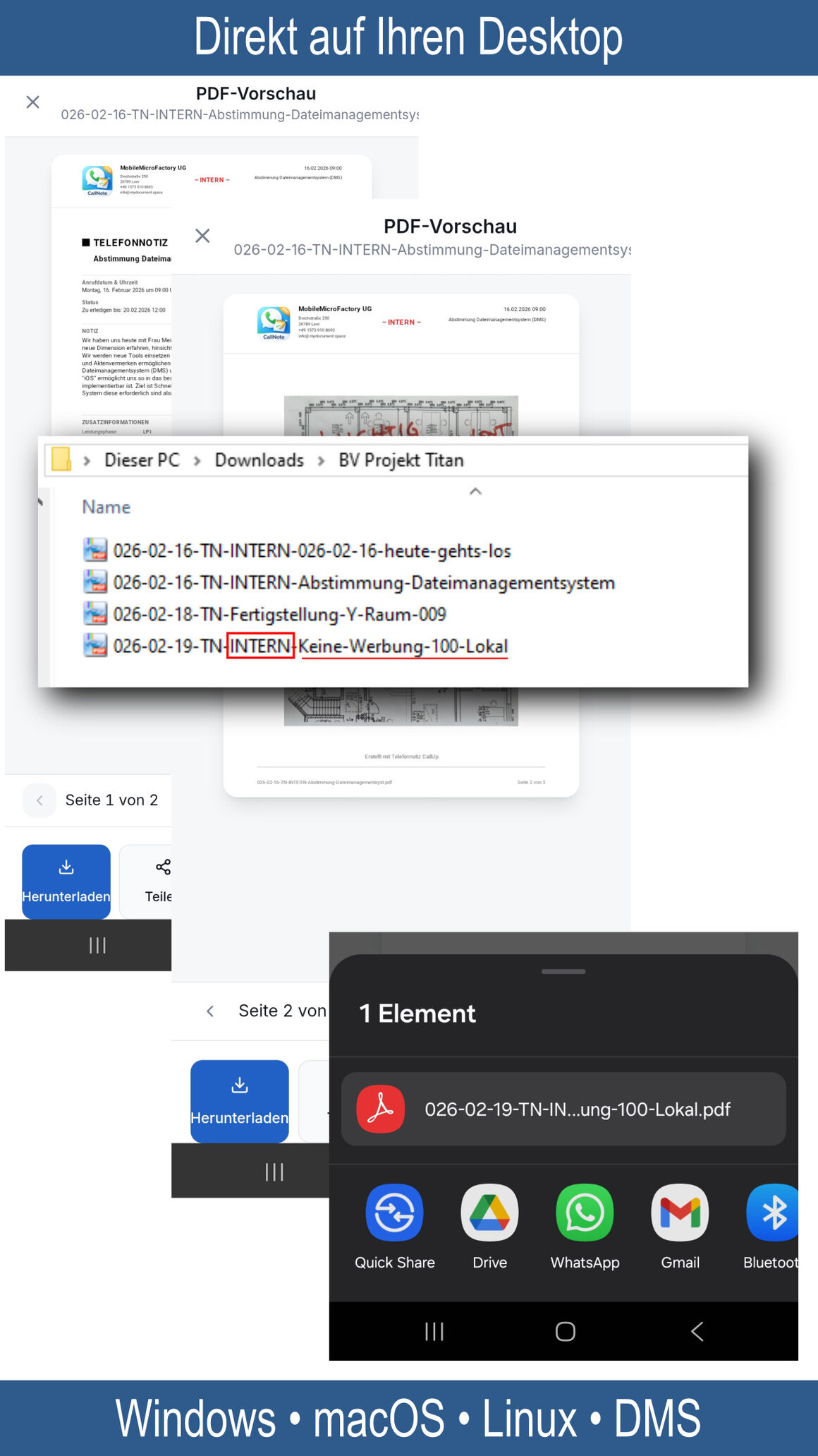 Dadurch sind Gesprächsvermerke auch außerhalb der App sofort systematisch auffindbar, eindeutig zuordenbar und ohne manuelle Nachbearbeitung direkt in bestehende Desktop-Ordnerstrukturen (Windows, macOS, Linux, Server- und Netzlaufwerke) integrierbar.