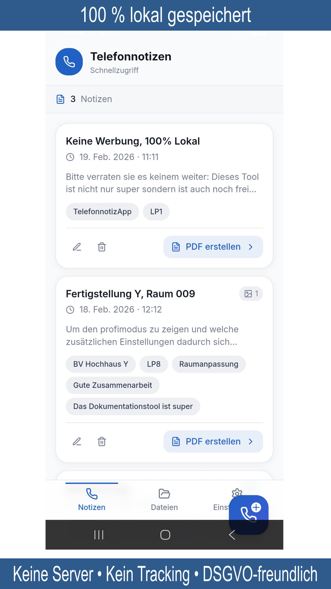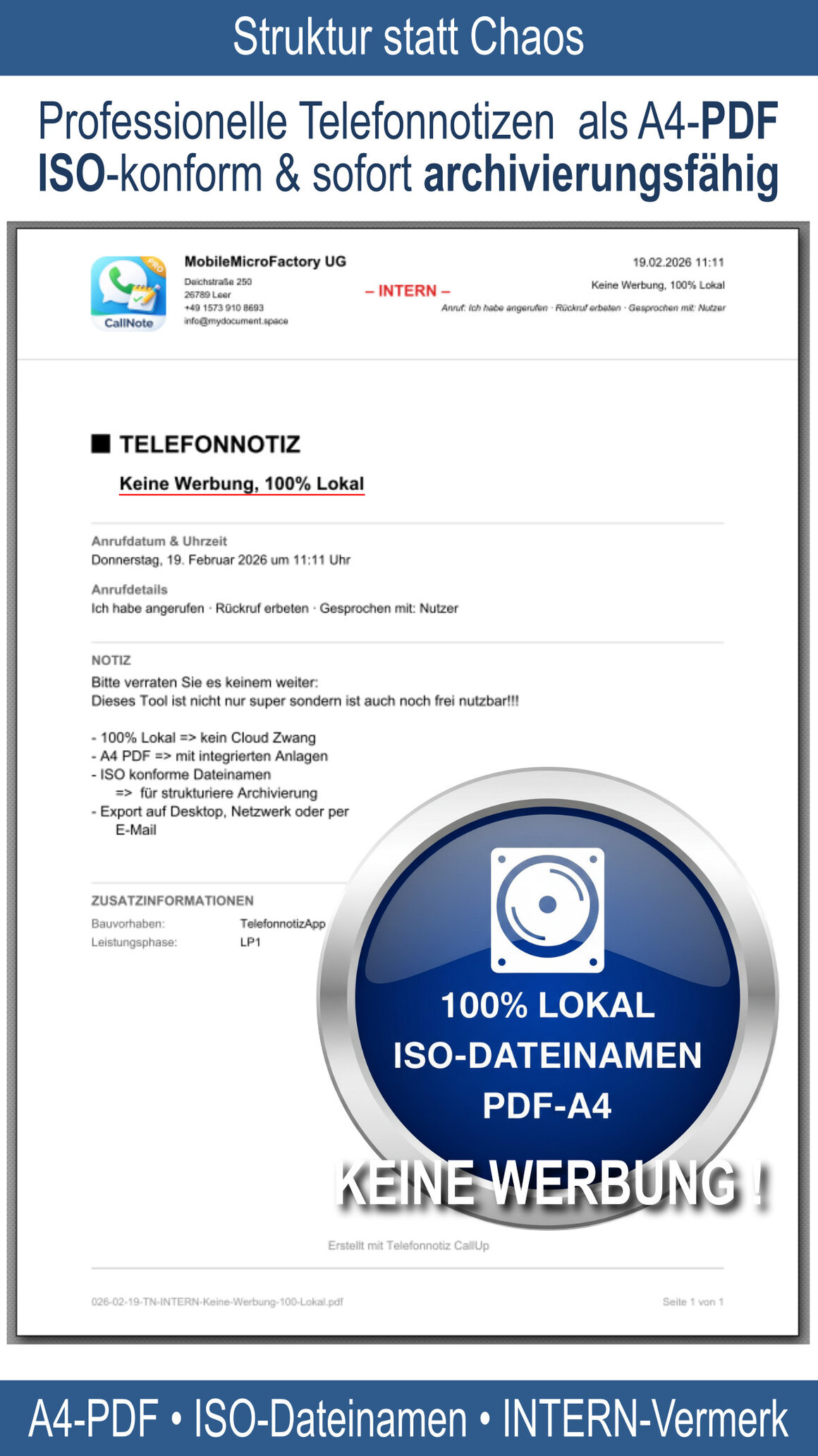 Unsere neue Telefonnotiz-App erzeugt revisionssichere A4-PDF-Telefonnotizen für professionelle Büro- und DMS-Umgebungen.