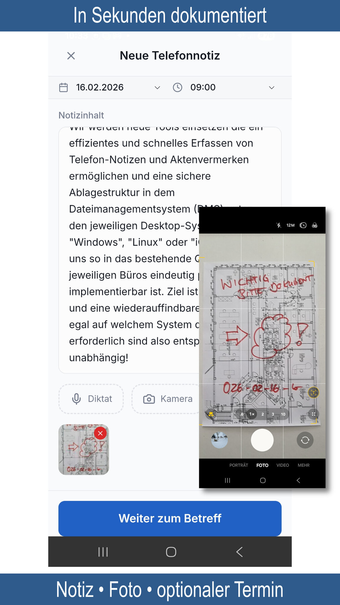 Die App unterstützt eine schnelle, revisionssichere und nachvollziehbare Dokumentation von Telefonaten und Gesprächsinhalten – ohne unnötige Komplexität oder Zeitverlust.